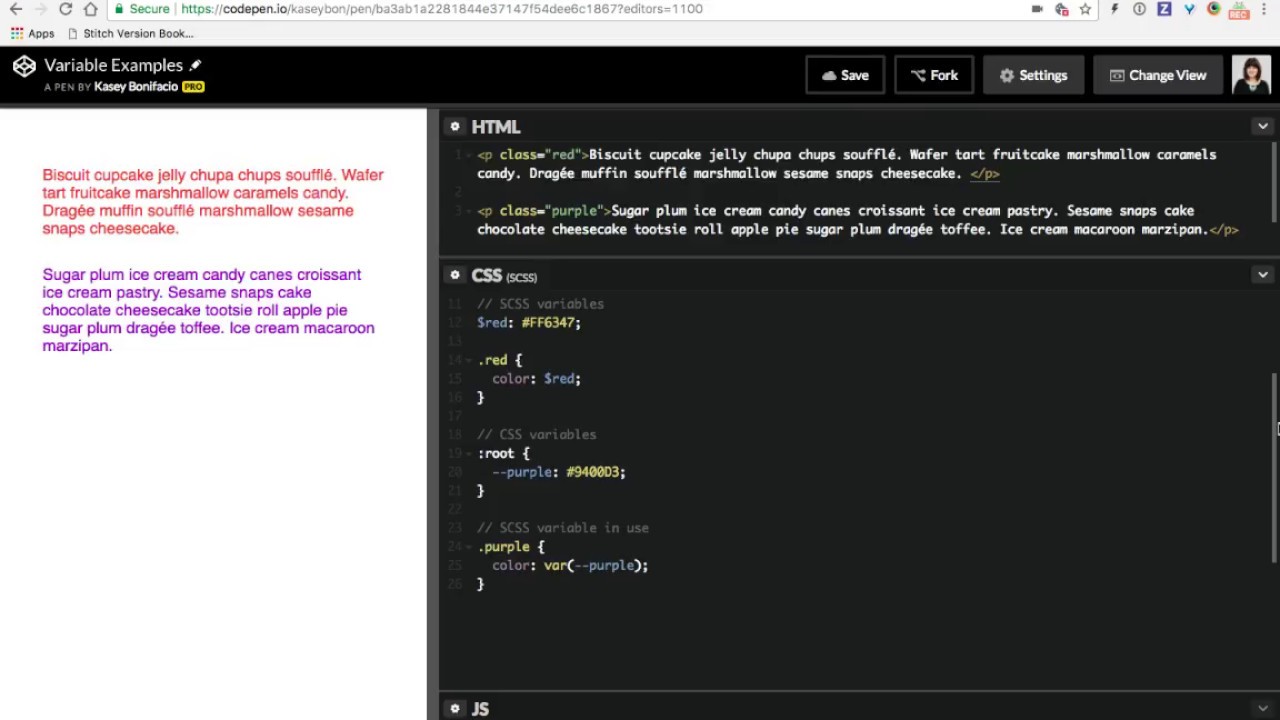 I would like to talk for a little bit about CSS variables and one of the ways in which they’re different from SCSS variables. Now for the past few years, I have written most of my styles in SCSS and one of my favorite benefits of SCSS is the ability to use variables. So, when I first heard of the new CSS variables I was excited to have that functionality built into CSS. After playing around with them a bit, I wasn’t a fan of the double dashes in variable names. And then in order to use a variable, you have to wrap it in a var() function, which felt odd.