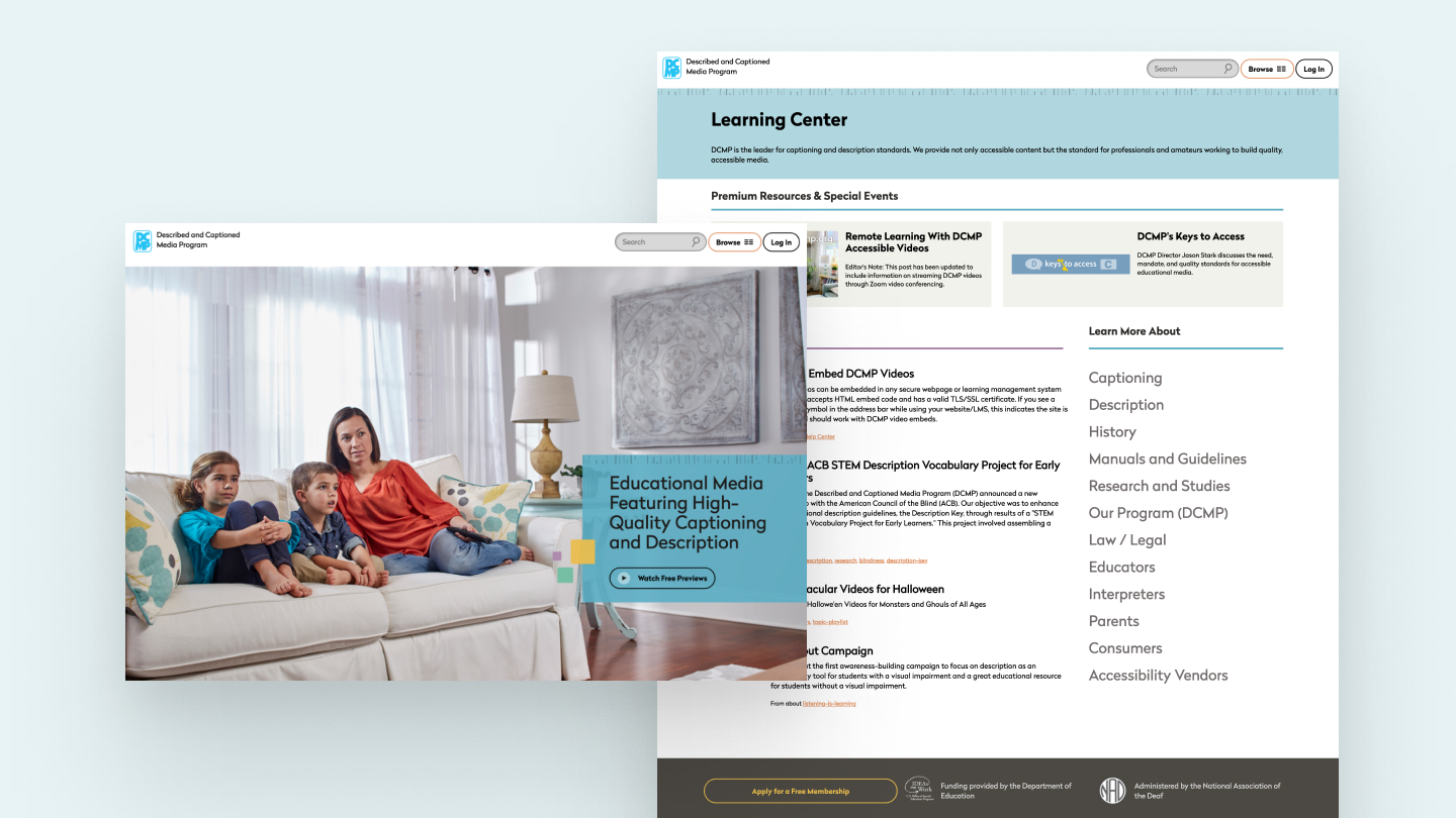 We jumped at the chance to work with the Described and Captioned Media Program (DCMP)—the people who wrote the standards for described and captioned video. Their website, DCMP.org, provides students with disabilities and their educators access to high-quality educational video content for free via a U.S. Department of Education grant. This content is fully accessible so they can learn from and enjoy the same media that others access.