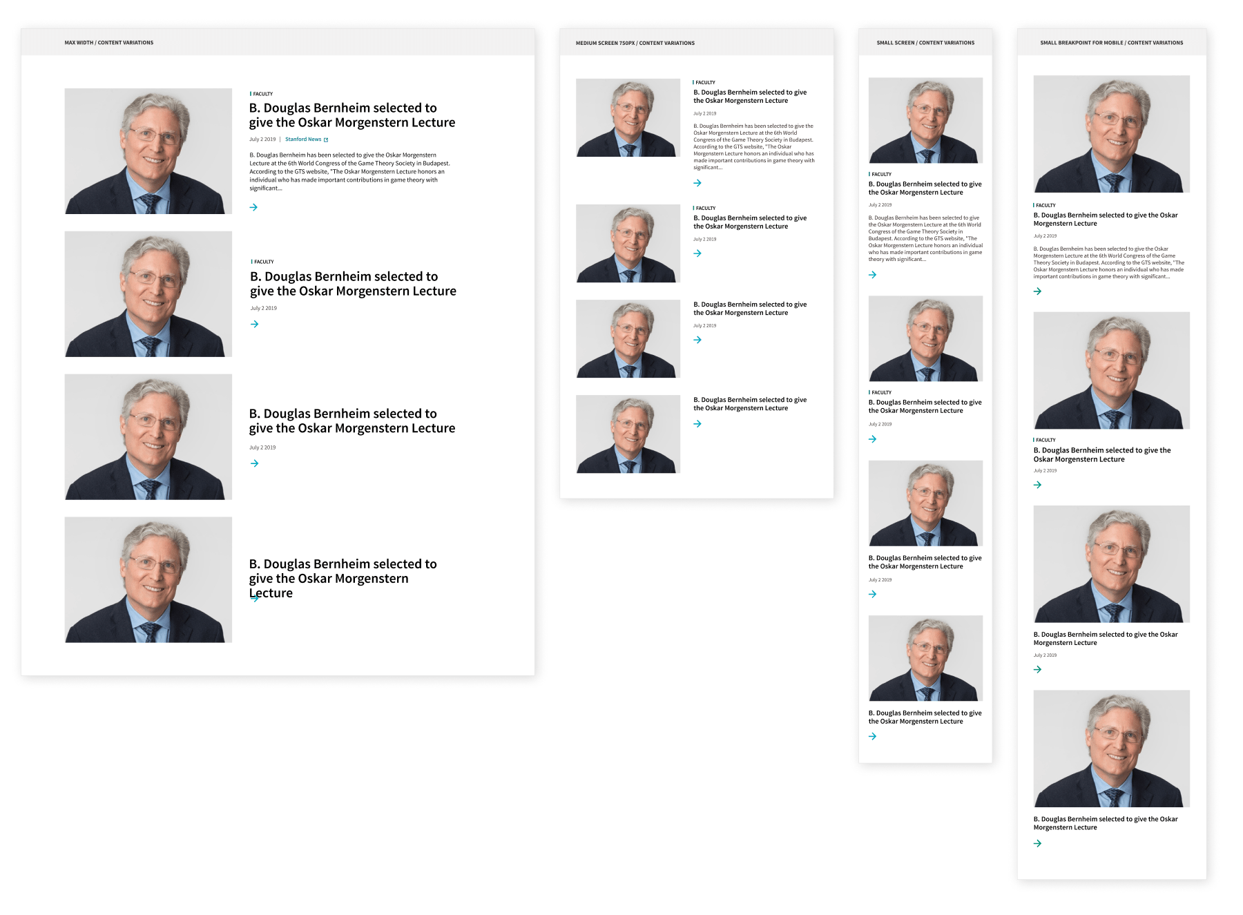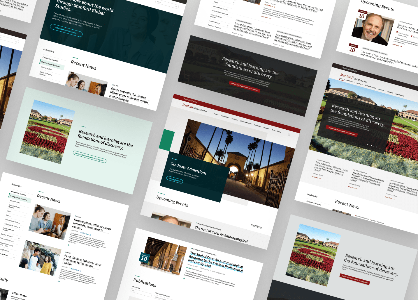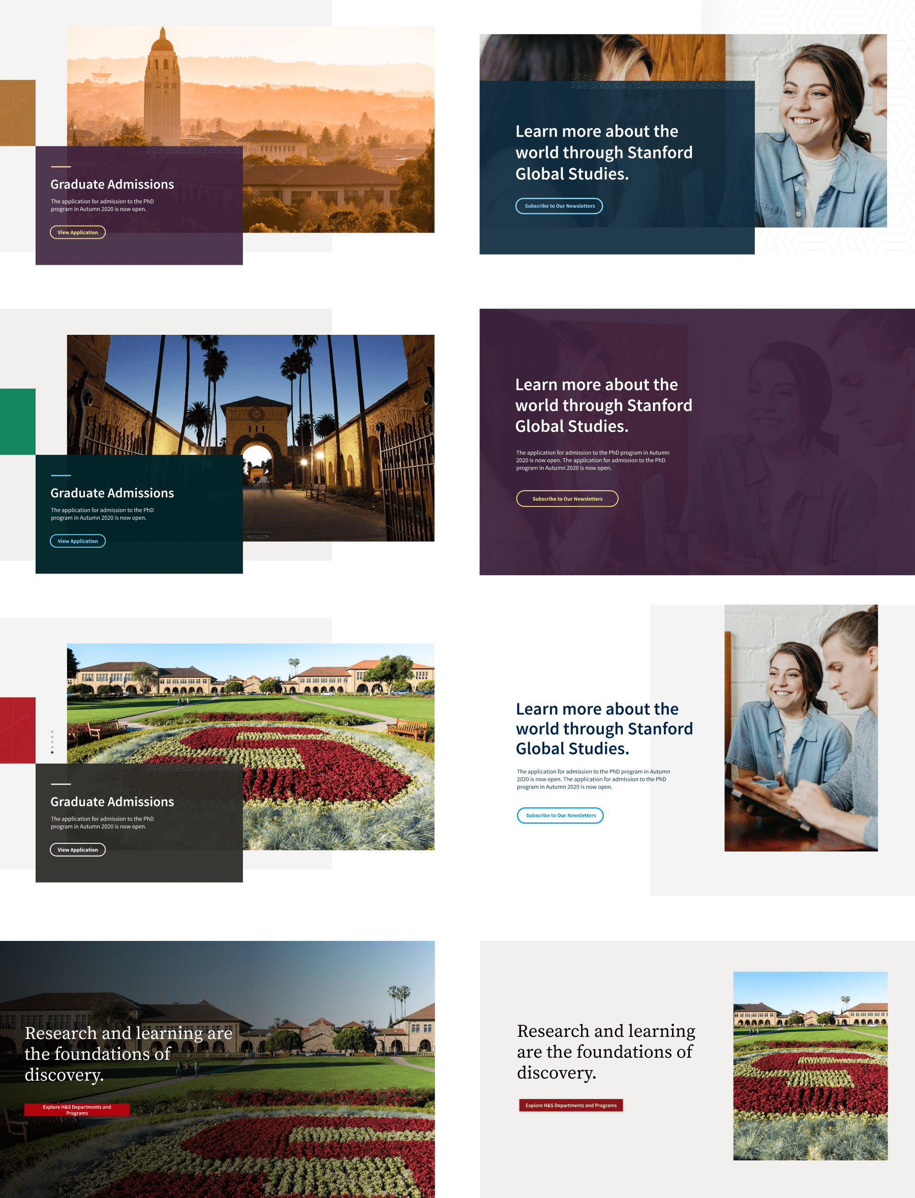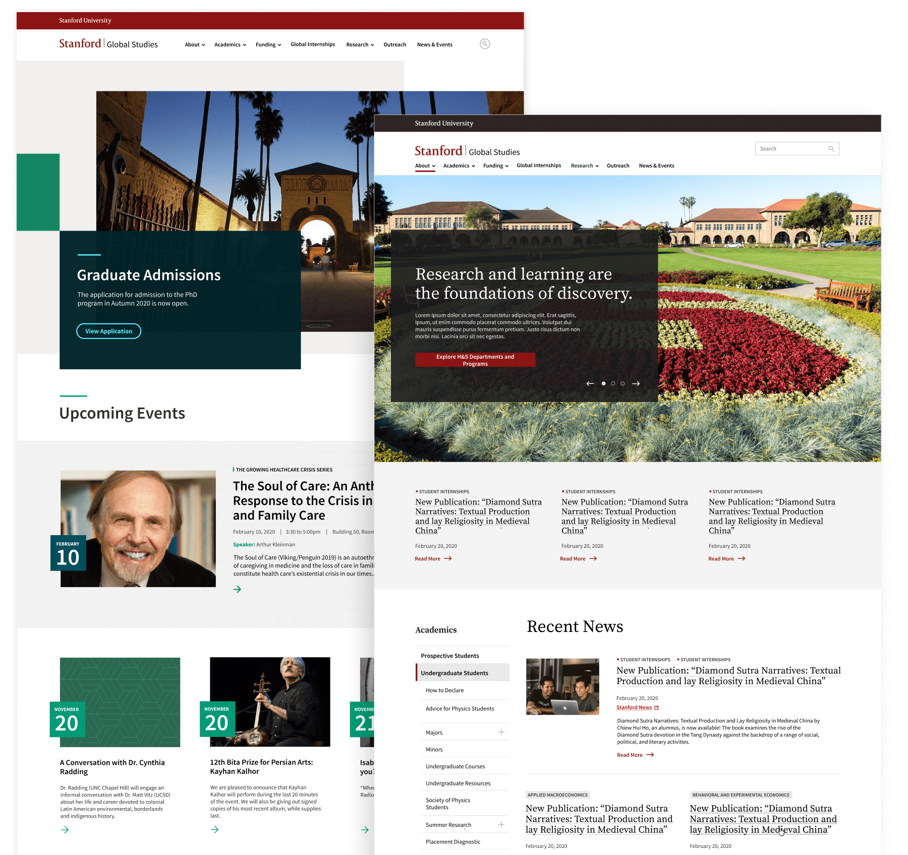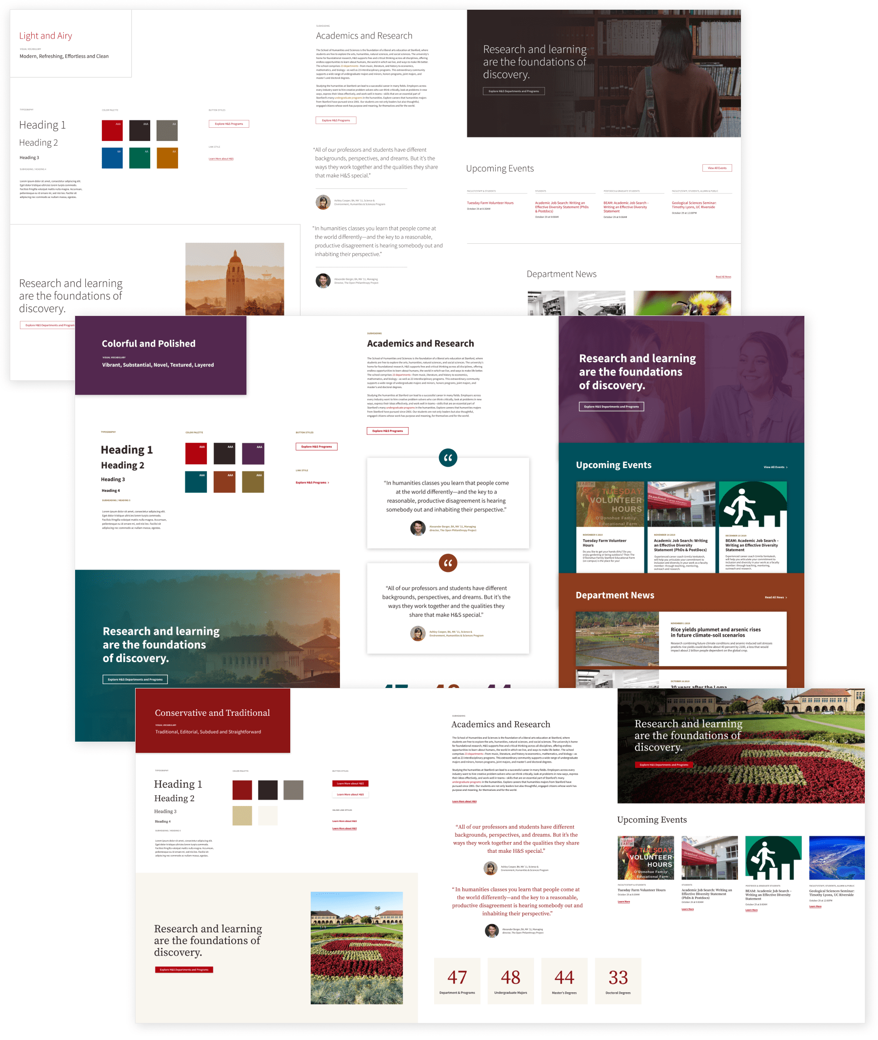 We settled on broad objectives for three themes, two of which were included in the scope of this initial engagement. We initially used page concepts to demonstrate how design elements would be utilized with realistic content. H&S elected not to fully utilize the existing Stanford design system, but a partial integration ensured alignment with the overall brand in areas like global headers and footers.