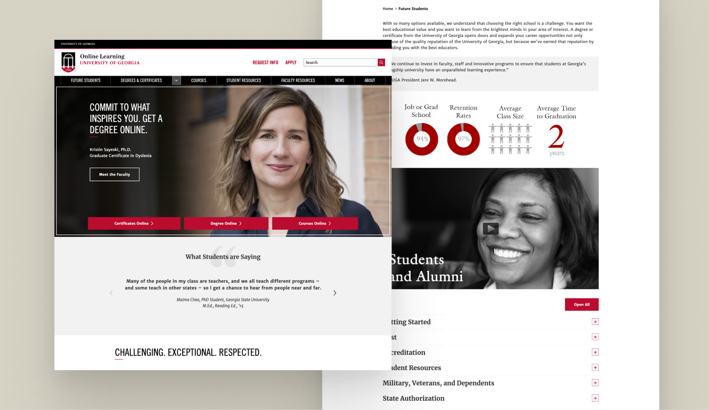 From the outset of this project, UGA Online had the opportunity to determine whether they wanted to fully redesign the website or concentrate on the design system. They opted for the design system, an approach that made good use of their well-established brand while setting the stage for long-term success by creating a reusable library of components.